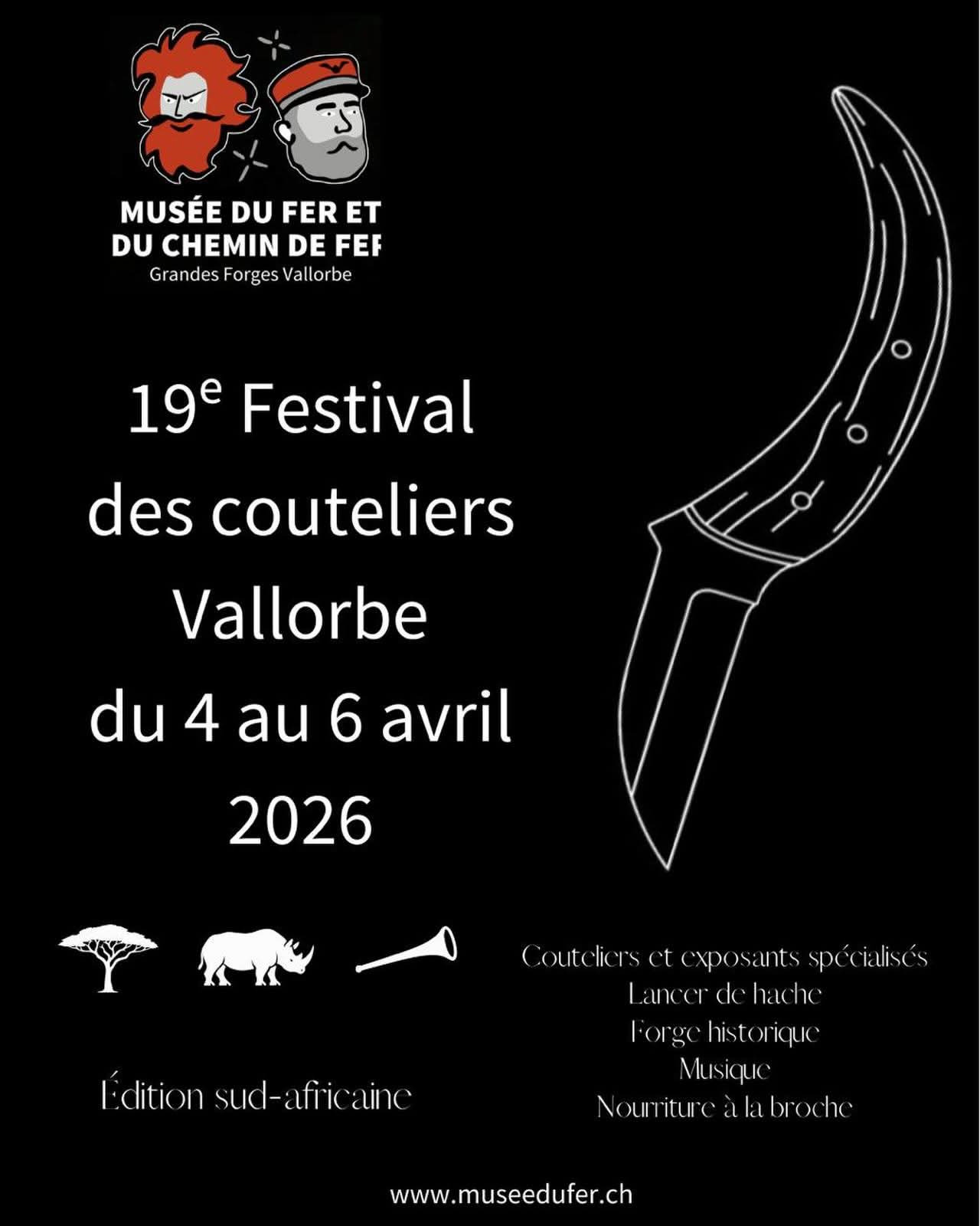 ⚔️ 19ᵉ Festival des Couteliers – Vallorbe ?? ? Du 4 au 6 avril 2026 Le Musée du Fer et du Chemin de Fer accueille la 19ᵉ édition du Festival des Couteliers, avec une édition spéciale sud-africaine. ? 35 artisans couteliers et exposants spécialisés ? Forge historique ? Lancer de hache ? Musique ? Nourriture à la broche Trois jours de passion, de savoir-faire et de rencontres exceptionnelles. ? Vallorbe ? Infos & billetterie : https://museedufer.ch/fr/festival-des-couteliers